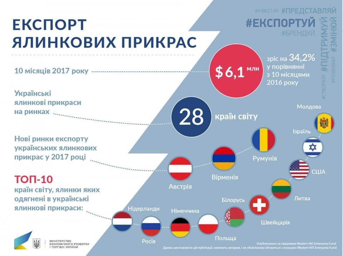 Загалом протягом минулого року українські ялинкові прикраси з'явилися на ринках 28 країн світу. Серед нових торговельних партнерів у цій галузі – Австрія, Румунія, Вірменія.