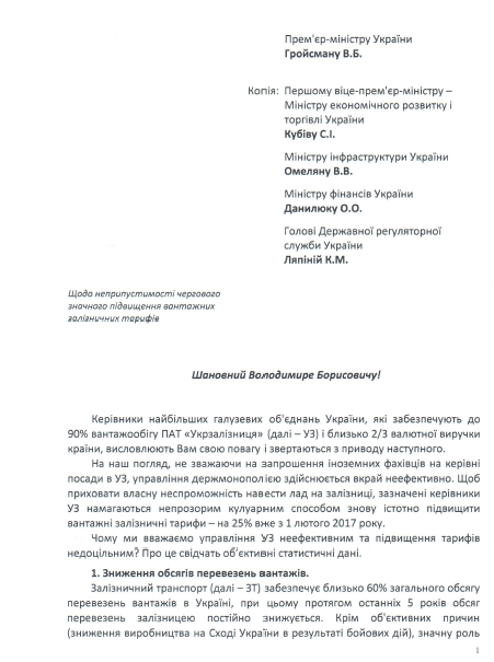 Відповідний лист Федерація металургів України, Об'єднання підприємств "Укрметалургпром", Українська зернова асоціація, Союз хіміків України, Українська асоціація виробників феросплавів, Асоціація "Укрцемент" і Асоціація "Укрскло" направили прем'єр-міністру Володимиру Гройсману, міністру економіки Степану Кубіву, міністру інфраструктури Володимиру Омеляну, міністру фінансів Олександру Данилюку та голові Держрегслужби Ксенії Ляпіній. Копія звернення опинилась у розпорядженні UAprom.