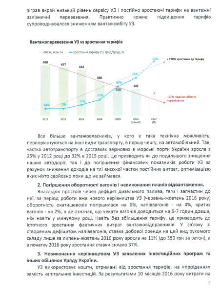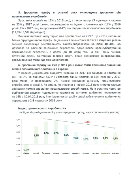 "Просимо Вас не допустити підвищення вантажних залізничних тарифів до створення незалежного органу – Нацкомісії регулювання тарифів на транспорті (НКРТ), який зможе професійно, виважено і об'єктивно оцінити обґрунтованість і доцільність перегляду вантажних тарифів", – мовиться у документі.