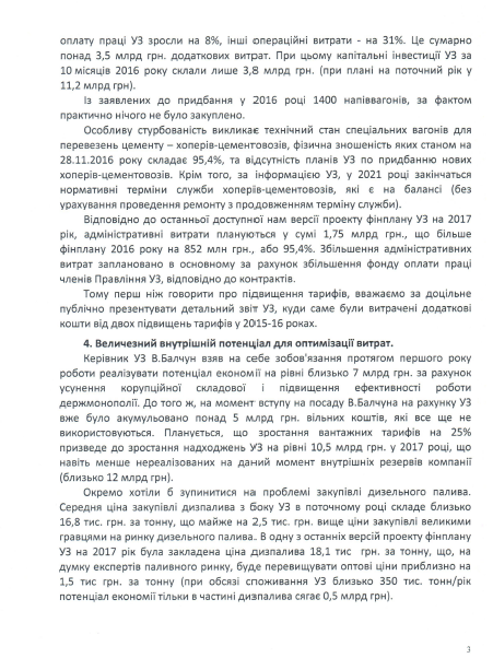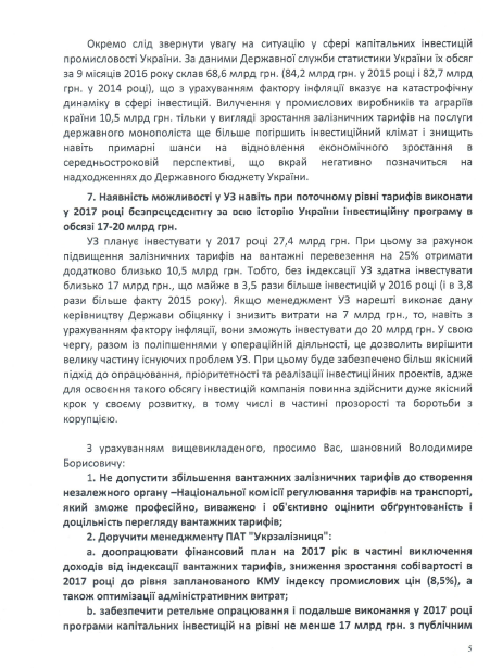 Останнім проханням до Гройсмана в листі зазначається: "Починаючи з 2017 року, не пізніше 20 днів після завершення кожного кварталу оприлюднити детальний щоквартальний звіт про виконання програми капітальних інвестицій, а також про виконання завдань щодо скорочення витрат "УЗ" в розрізі конкретних заходів".