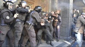 Із приміщення ГПУ спершу розпилили газ, потім почали поливати мітингарів водою. Учасники ж протесту кидали у приміщення бруківку, розбили двері та підпалили смітник. Унаслідок сутичок постраждали семеро поліцейських.