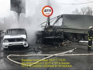 За даними свідків, водій фури проігнорував червоний сигнал світлофора, пролетів на швидкості та врізався у відбійник. Зачепив при цьому інші автомобілі. Внаслідок зіткнення зайнялася і фура, і решта автівок. Загалом, окрім вантажівки постраждали ще три машини. Стовп диму сягав кілька метрів. За попередніми даними, минулося без жертв. На місці працюють поліцейські, рятувальники та карети швидкої.