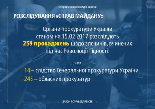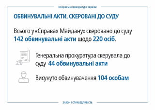 Генеральна прокуратура України у справах Майдану скерувала до суду обвинувальні акти щодо 220 осіб. Крім того, нині органи прокуратури розслідують 259 проваджень щодо злочинів, вчинених під час Революції Гідності. Про це повідомив генпрокурор Юрій Луценко та оприлюднив відповідну інфографіку на своїй сторінці у Facebook.