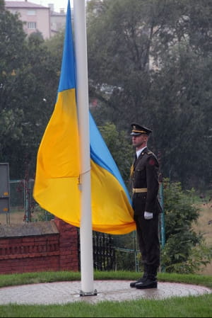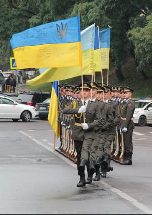 Підняття Державного Прапора України у Львові. Маленька дівчинку на руках у солдата роти почесної варти – Ангеліна Гуртяк. Її батько, молодший лейтенант, воював і віддав життя за Україну. На інших фото воїни урочисто виносять національні знамена, що стали реліквіями – прапори України, що були у боях разом із солдатами військових частин, які дислокуються на Львівщині.