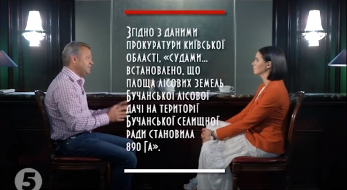 – Насправді резонансні декілька тижнів зараз у вашому житті і в житті Бучі Київської області. Обшуки 21 липня, вам загрожує від 6 до 12 років, якщо зловживання службовим становищем або перевищення повноважень таки доведуть. Давайте розберемося взагалі в цій ситуації. Наскільки я розумію, камінь спотикання – це землі. Землі, яких за рішенням 2002 року, коли ви вже протягом 18 років мер Бучі, місцева рада незаконно змінила цільове призначення зелених зон колишньої Бучанської лісової дачі. 890 гектарів лісу першої категорії Бучанська рада "роздерибанила", як то кажуть, цитата, між собою під забудову – кажуть принаймні. Зараз ви скажете, в чому правда. Прокуратура звернулася з позовом наприкінці 2015 року. Рішенням Верховного суду України позов було задоволено, а землі повернуті державі. Ви з цим незгідні, наскільки я розумію, так? І це рішення не виконується?