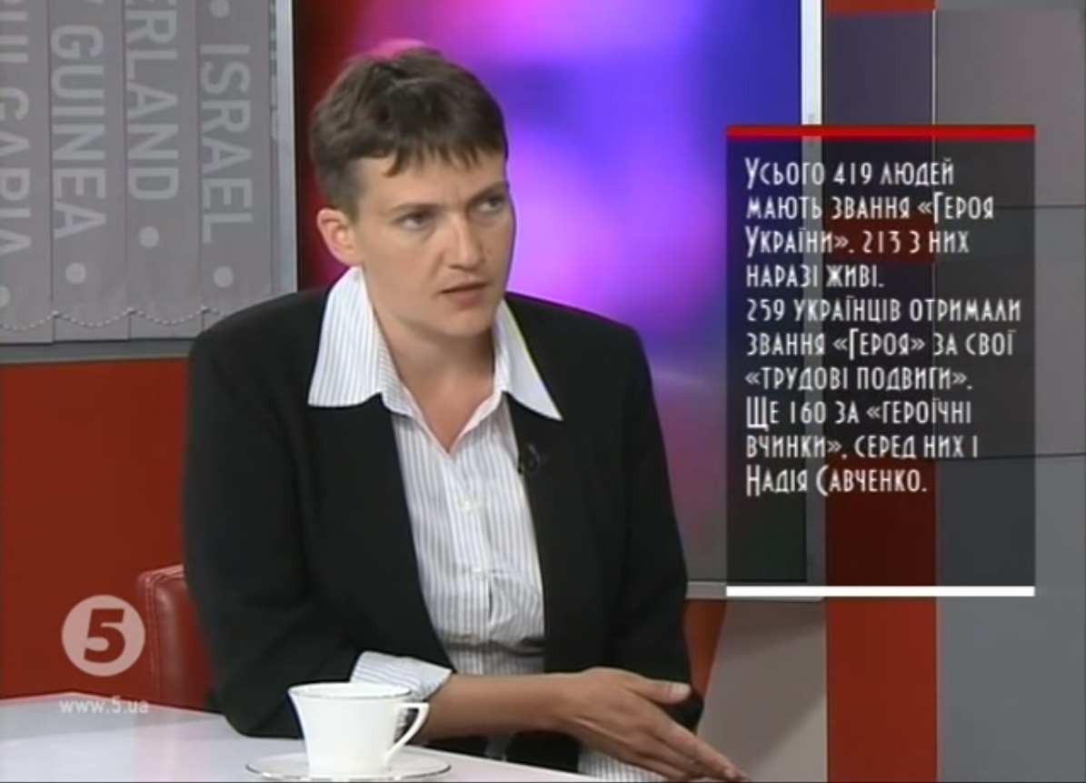 – У нас є друге запитання, воно стосується вашого звання – звання Героя України. Пан Володимир Кулигін питає російською мовою. Аби абсолютно точно, я навмисне не перекладаю: "Что она получила, звание Украины, в чем героизм Нади? И пожалуй еще один вопрос.Есть ли у вас намерение отказаться от, на нашу думку, незаслуженного присвоенного звания?” Це пан Володимир Кулигін питає.