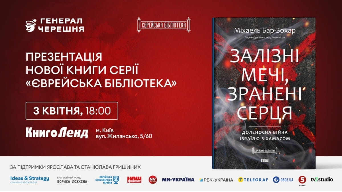 Книга "Залізні мечі, зранені серця. Доленосна війна Ізраїлю з ХАМАСом" відомого ізраїльського історика і популярного письменника Міхаеля Бар-Зохара стала дев'ятою за переліком у книжковій серії "Єврейська бібліотека", започаткованій Єврейською конфедерацією України. Літературний доробок побачив світ за підтримки Ярослава та Станіслава Гришиних, співзасновників провідного українського виробника дронів "Генерал Черешня".