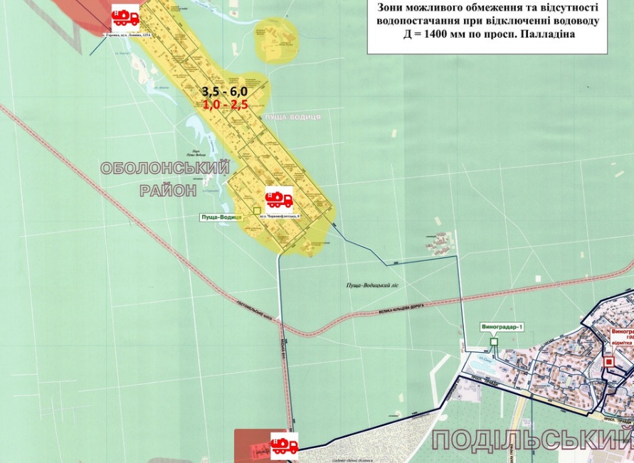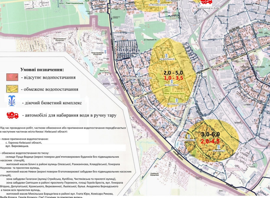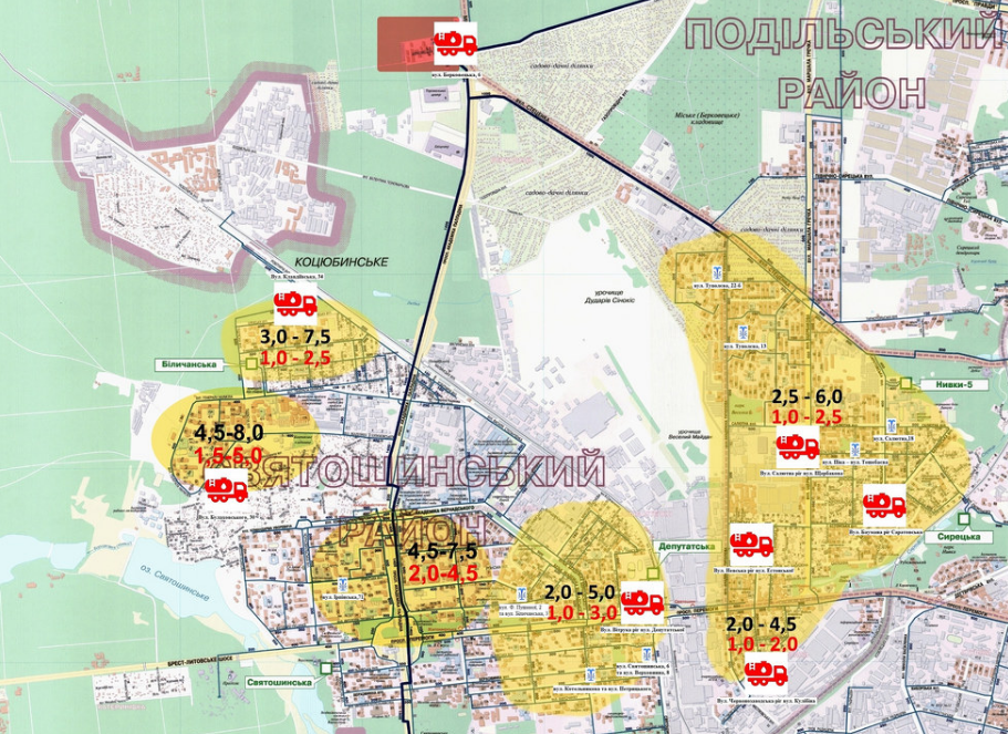 – на житловому масиві Новобіличі (вул. Булаховського, Генерала Наумова, Підлісна, Олевська, Робітнича, просп. Палладіна). Водовозка – вул. Клавдіївська, 34 та вул. Булаховського, 30; - на масивах Святошин, Академмістечко та Біличі (вул. Чорнобильська, Уборевича, бульв. Вернадського, вул. Кржижановського, Степанченка, Святошинської, Відпочинку, Верховинної та Кільцевої дороги). Водовозка – вул. Вітрука ріг вул. Депутатської. Бювети: по вул. Святошинська, 6, ріг вул. Верховинної; Котельникова ріг вул. Петрицького; вул. Пушиної ріг вул. Біличанської; вул. Ірпінська, 71.