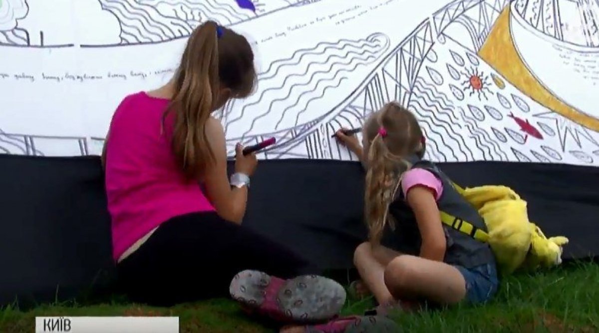 40-метровий ескіз із контурними обрисами України розмалювати яскравими барвами прийшли дорослі та діти. Разом із відвідувачами, малюнок розфарбовує й авторка, відома українська художниця Олександра Жумайлова. Розповідає, що працювала над створенням картини шість днів. У ній намагалася передати бачення українцями майбутнього своєї держави.
