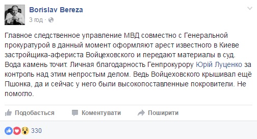 "Головне слідче управління МВС спільно з Генеральною прокуратурою наразі оформлюють арешт відомого у Києві забудовника-афериста Войцехівського і передають матеріали до суду", – написав він.