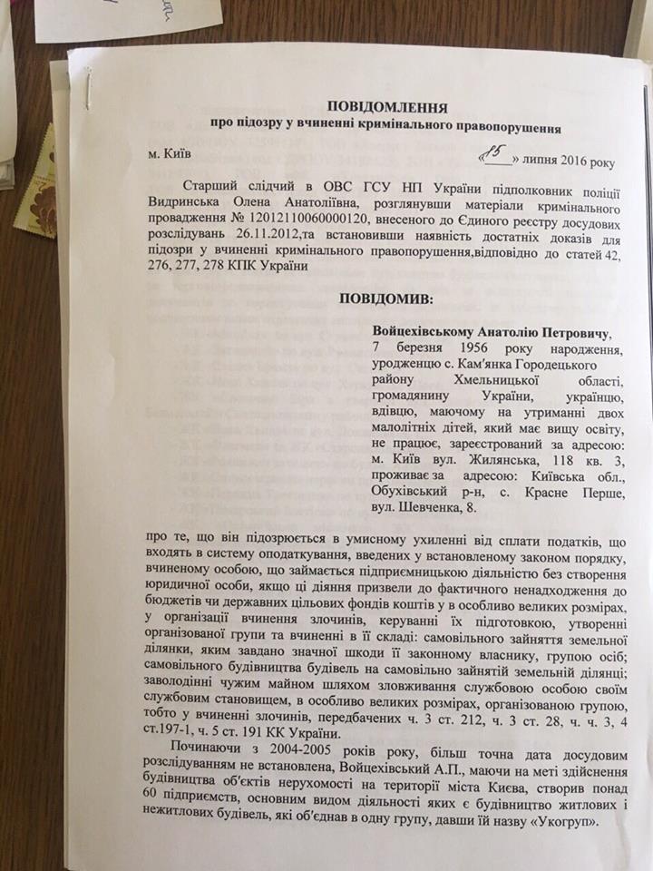 "Генеральною прокуратурою 15.07.2016 погоджено повідомлення про підозру Войцехівському за ч. 3 ст. 212 КК України за фактами умисного ухилення від сплати податків на суму 12,5 млн грн, за ч. ч. 3, 4 ст. 197-1 та ч. 5 ст. 191 КК України за фактами створення організованої злочинної групи для самовільного захоплення земельної ділянки територіальної громади м. Києва по вул. Закревського, 42 та будівництва ЖК "Перлина Троєщини", заволодіння під час цього будівництва шляхом обману коштами громадян на суму 2,6 млн грн", – повідомляє ГПУ.