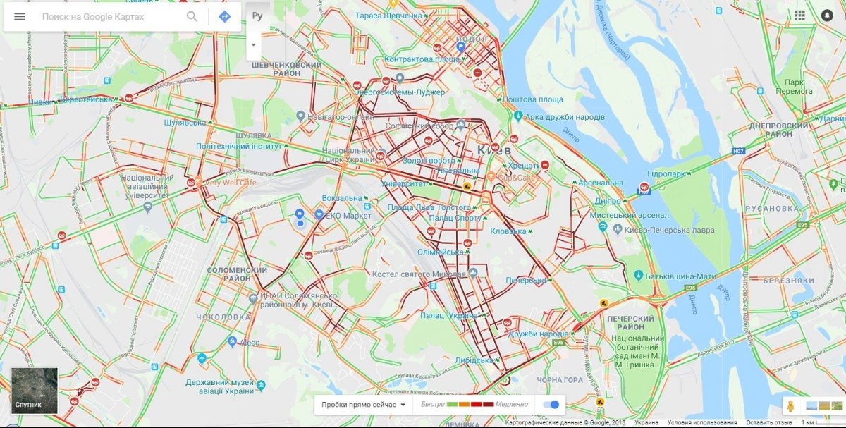 У масштабних заторах завмерла столиця. Про це свідчить онлайн-сервіс Google Maps.