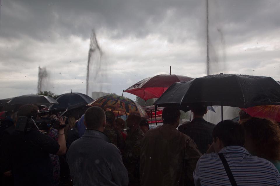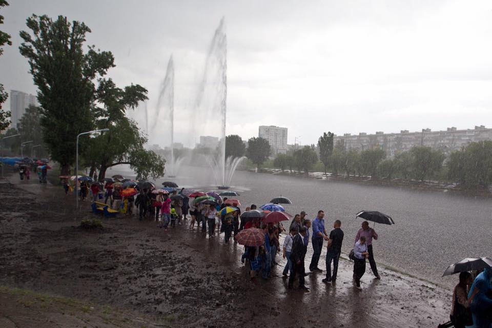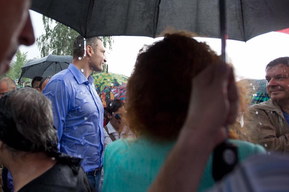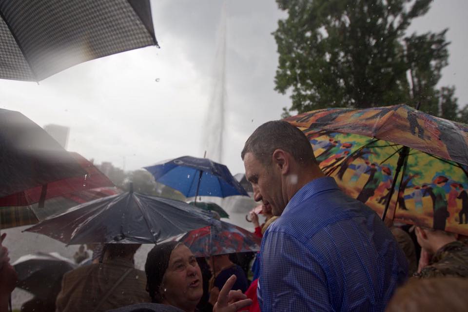 Попри те, що під час запуску фонтану розпочалася злива, Кличко пожартував, що "це на фарт" і продовжив спілкуватися з місцевими мешканцями.