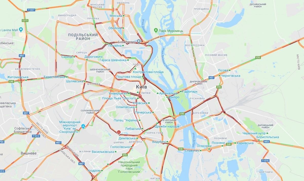 Найбільше ускладнено рух у центрі Києва, зокрема по вулиці Хрещатик, бульвару Тараса Шевченка, Набережному шосе, вулицях Саксаганського та Жилянській, бульварах Лесі Українки та Дружби народів.