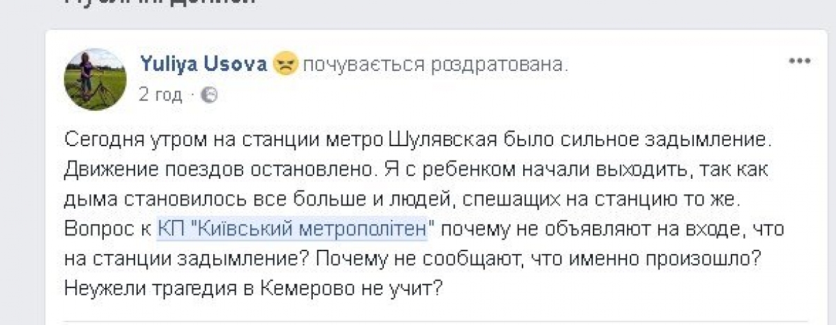 "Не знаю, що сталося на Вокзальній, але на Шулявці в цей час загорівся поїзд, було задимлення. Всі почали вибігати з вагона на ескалатор", – зазначила Надія Микицей у Facebook.