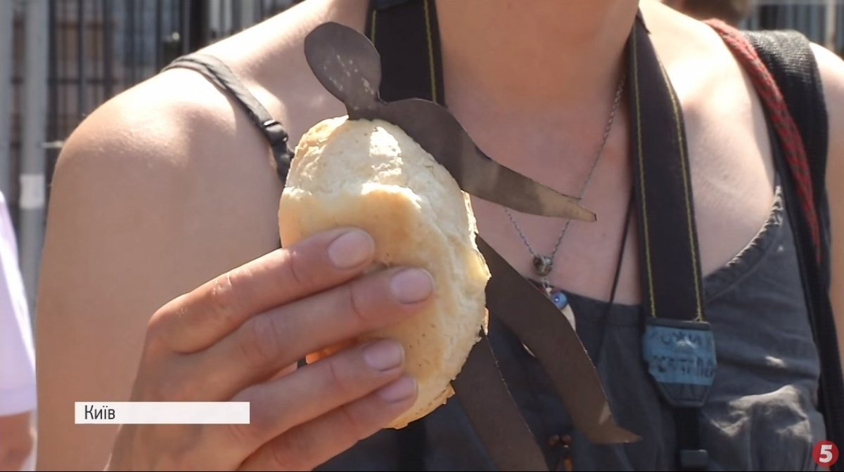 "Сенс в тому, що кремлівський режим пожирає людей. І на символ цього вкладені в ці булочки такі людські фігурки. Їх кількість відповідає кількості кремлівських бранців, заради яких Олег Сенцов оголосив голодування", – пояснює учасниця акції, письменниця Олена Максименко.