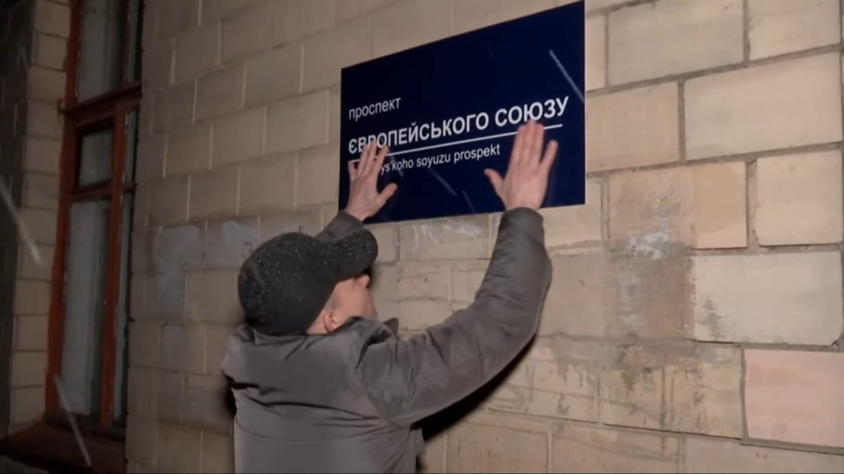 Біля одного з будинків Повітрофлотського проспекту політичний та економічний експерт Борис Кушнірук провів символічну акцію з декомунізації – прикріпив табличку з назвою "Проспект Європейського Союзу".