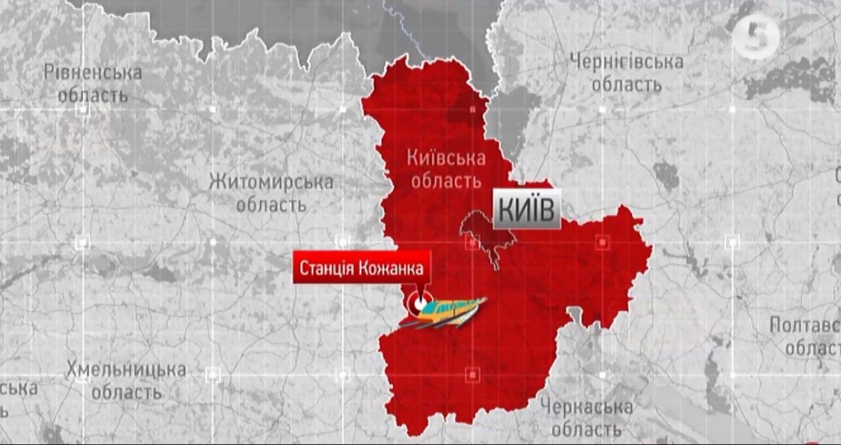 Інцидент стався о шостій годині ранку поблизу станції Кожанка. У Південно-західній залізниці зазначають, що поїзд рухався із Козятина до Фастова. Внаслідок події рух залізничними шляхами тимчасово був заблокований.