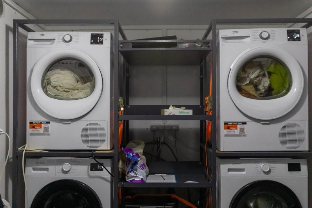 Мобільний пункт допомоги киянам, в якому можна випрати і висушити речі, а також зарядити гаджети і випити гарячого чаю, розгорнули на вулиці Бориспільській.