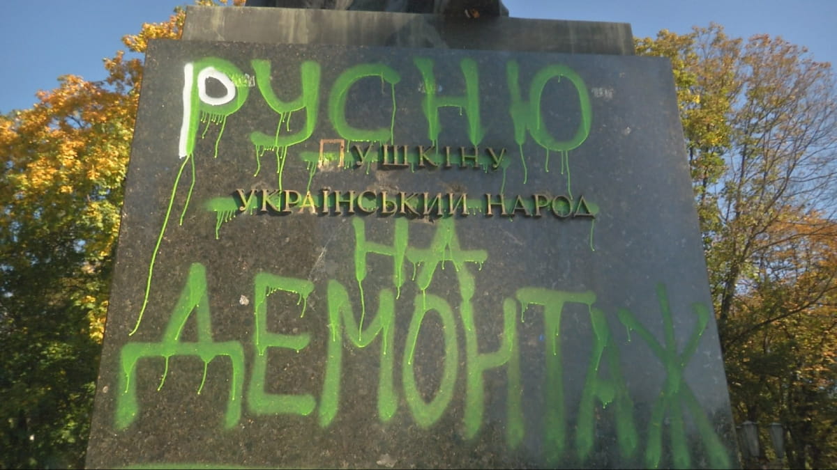 "Русню на демонтаж" і "Знести радянську пропаганду" – такими закликами ентузіасти прикрасили трійку пам'ятників у столиці. Яскраві написи вихідними з'явилися на монументах Пушкіну, Щорсу і пам'ятнику робітникам трамвайного депо, загиблим у Другій світовій. А незабаром розмалювали бюст Пушкіна на станції метро "Університет".