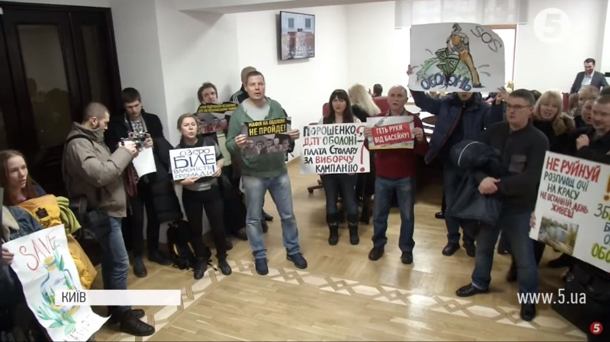 В кулуарах людно. Активісти – проти нового детального плану території на Оболоні. Пояснюють: за документом на вулиці Героїв Сталінграда планують звести три багатоповерхівки. Але для цього мають знести дитячий басейн і знищити тамтешнє озеро.