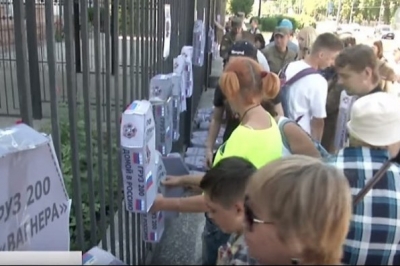 Михайло Макарук, спікер волонтерської організації "INFORM NAPALM" пояснив: "Це є гроби з емблемами "м 209". Це особистий номер пана Уткіна, який очолює ЧВК "Вагнера". А в середині гробиків наклеєні подарунки для посольства РФ – фотографії загиблих бійців-вагнерівців, які загинули в Україні та Сирії.