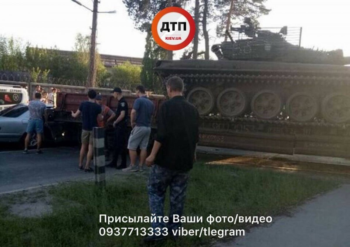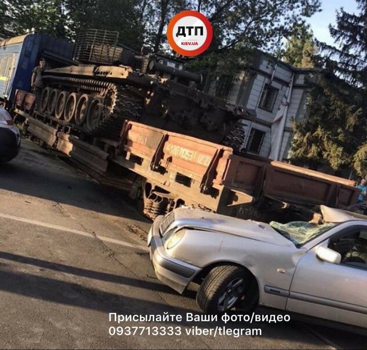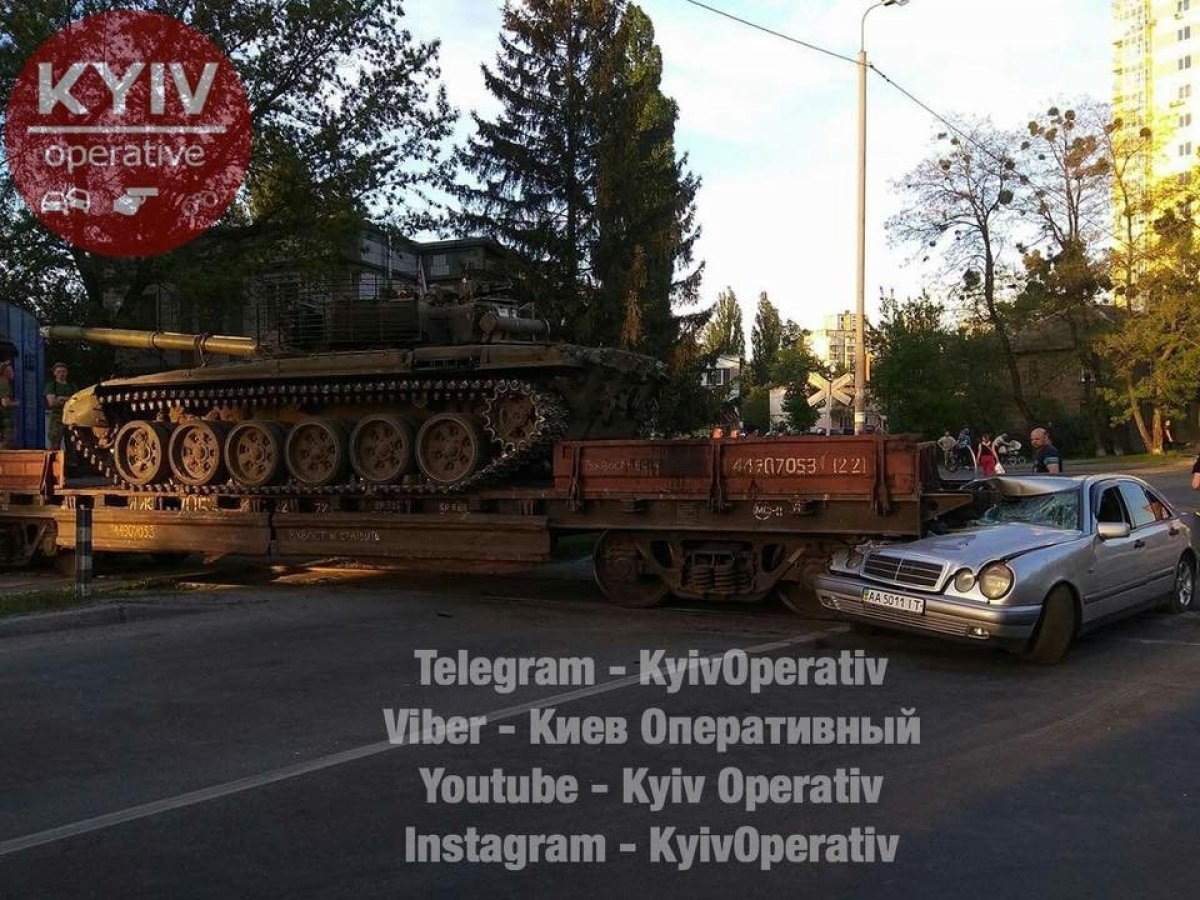 На вулиці Бориспільській у Дарницькому районі Києва надвечір четверга, 3 травня, легковий Mercedes протаранив потяг, яким в цей час саме перевозився танк. Про це повідомляє "Київ Оперативний" у Facebook, докладаючи і фото з місця інциденту.