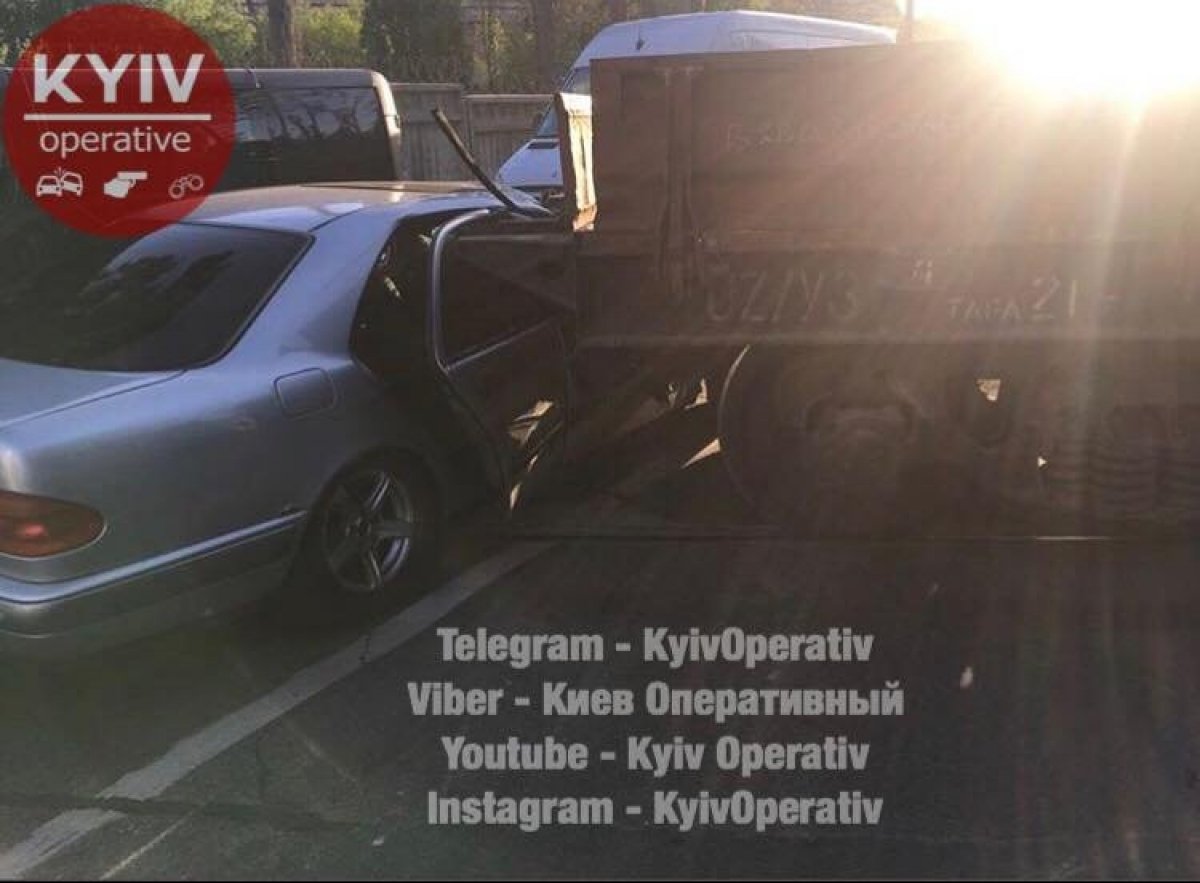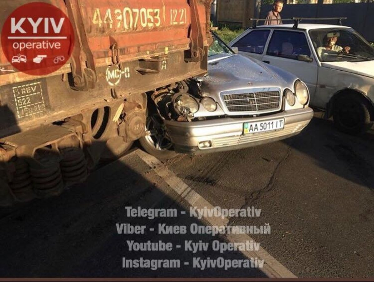 "Біля Бориспільської, 19, сталася аварія за участю автомобіля Mercedes та вагона потяга, на якому перевозили танк. Молодики (23-25 років), які знаходилися в автівці, проігнорували сигнал регулювальника та червоний світлофор, і на доволі серйозній швидкості здійснили зіткнення. Скоріше за все засліпило сонцем," – мовиться в повідомленні.