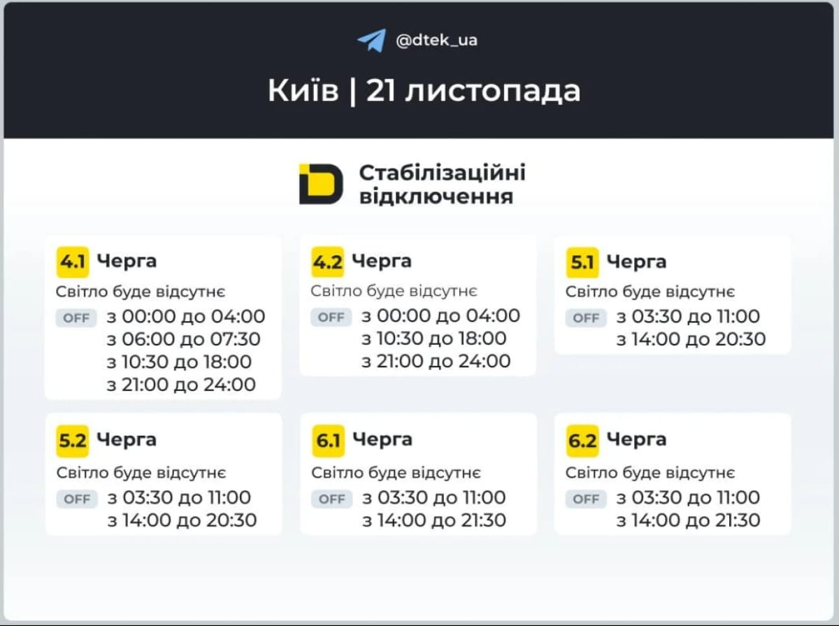 Київські електромережі ДТЕК оновили розклад вимкнень світла на 21 листопада.