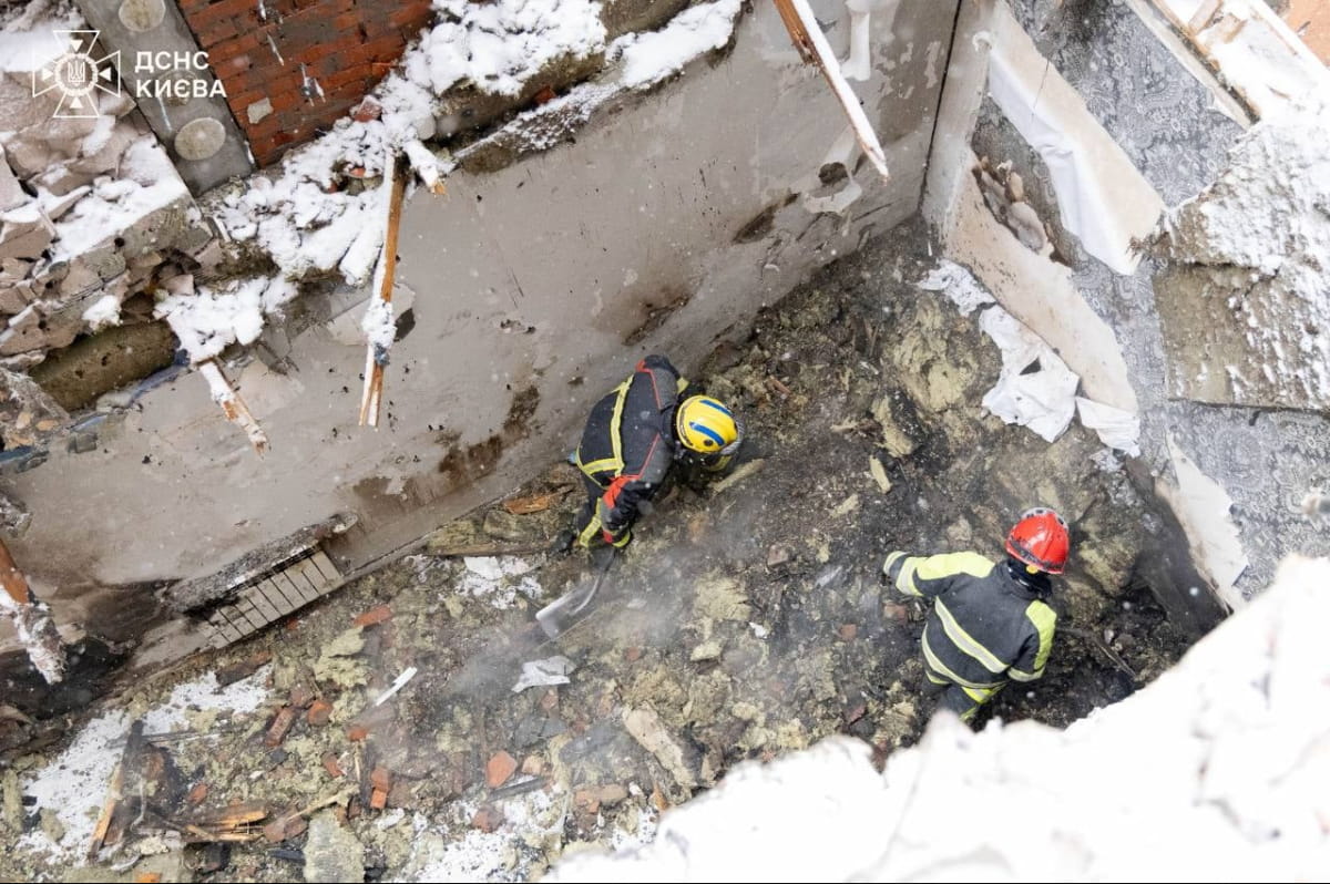У Києві завершили роботи з ліквідації наслідків ворожого обстрілу. Станом на 17:00 4 загиблих та 25 потерпілих, із яких 5 рятувальників. Про це повідомили в ДСНС.