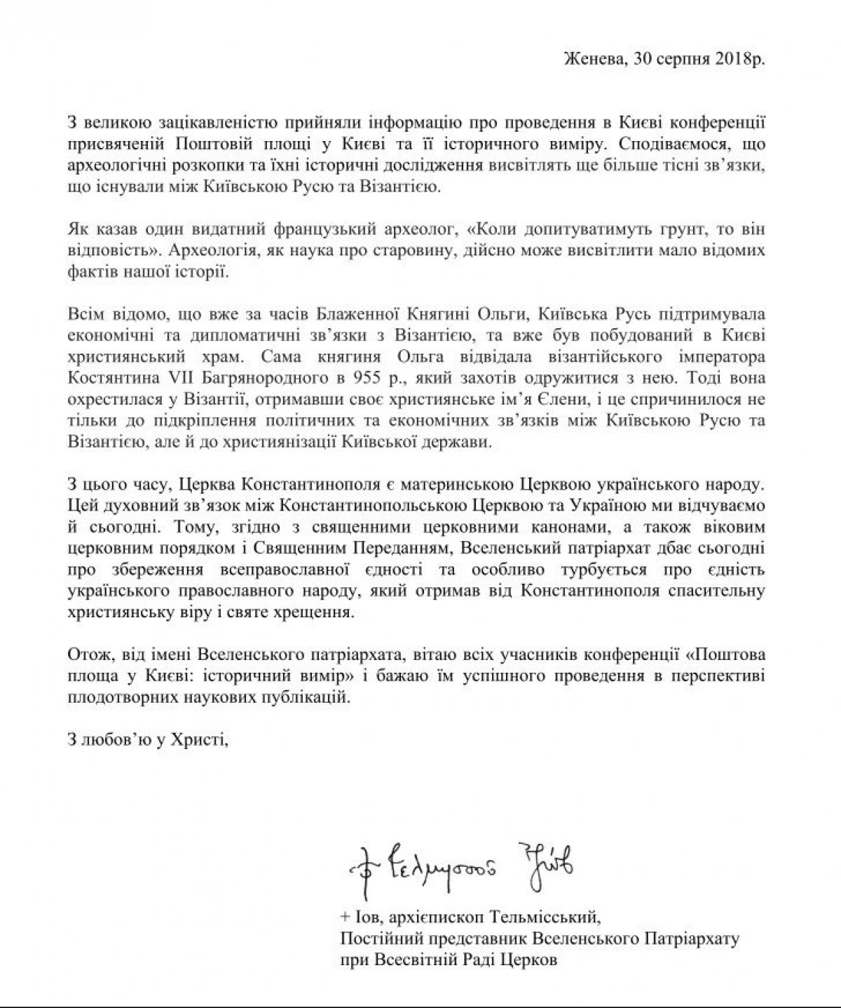 Археологічні розкопки та їхні історичні дослідження ще більше висвітлять тісні зв’язки, що існували між Київською Руссю та Візантією – такі сподівання висловив у своєму зверненні постійний представник Вселенського Патріархату при Всесвітній Раді Церков архієпископ Тельмісський Іов.