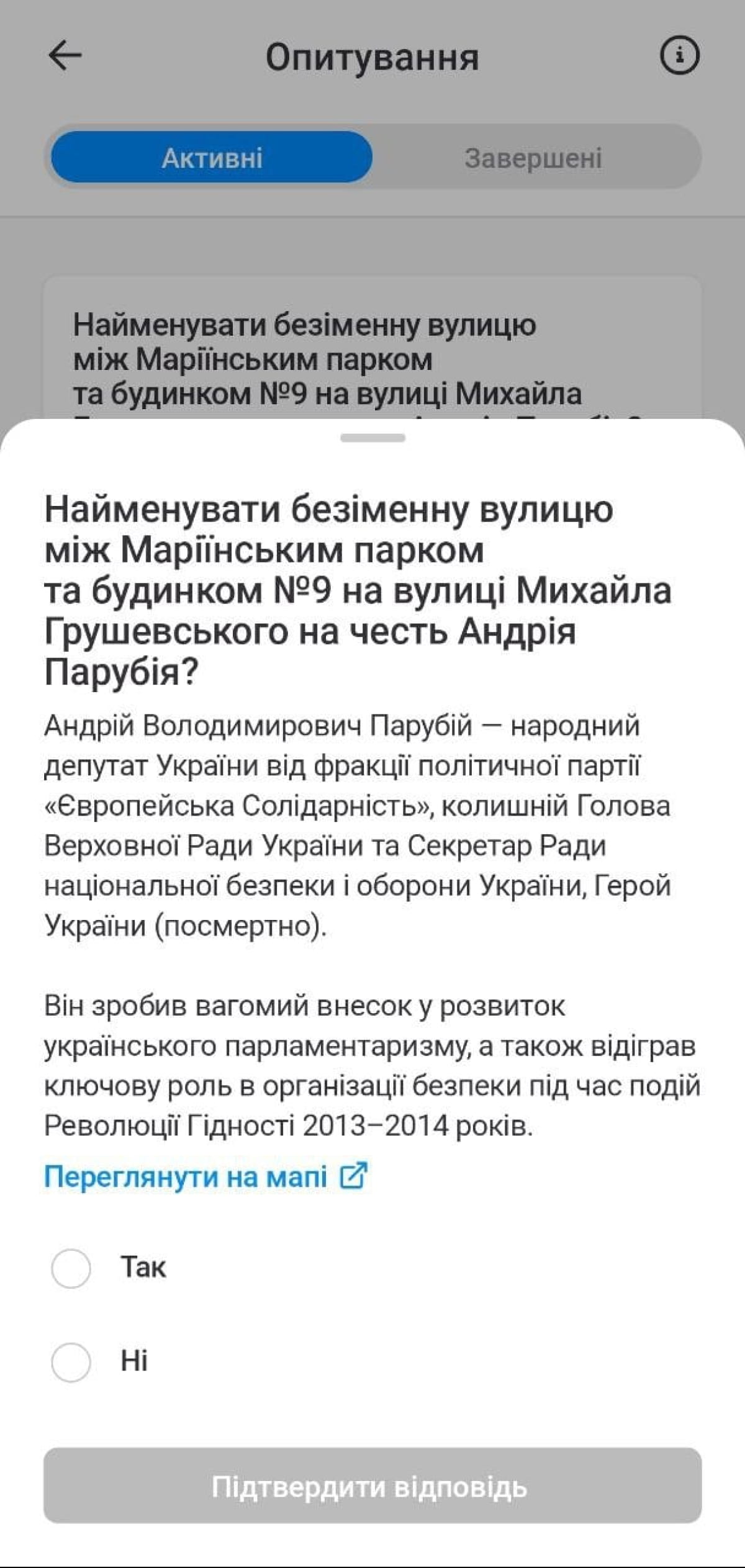 У столичному застосунку "Київ Цифровий" триває голосування щодо найменування проїзду між Маріїнським парком та будівлею Верховної Ради на честь видатного державного діяча, колишнього голови парламенту та народного депутата від "Європейської Солідарності" Андрія Парубія.