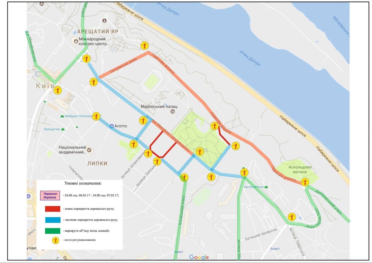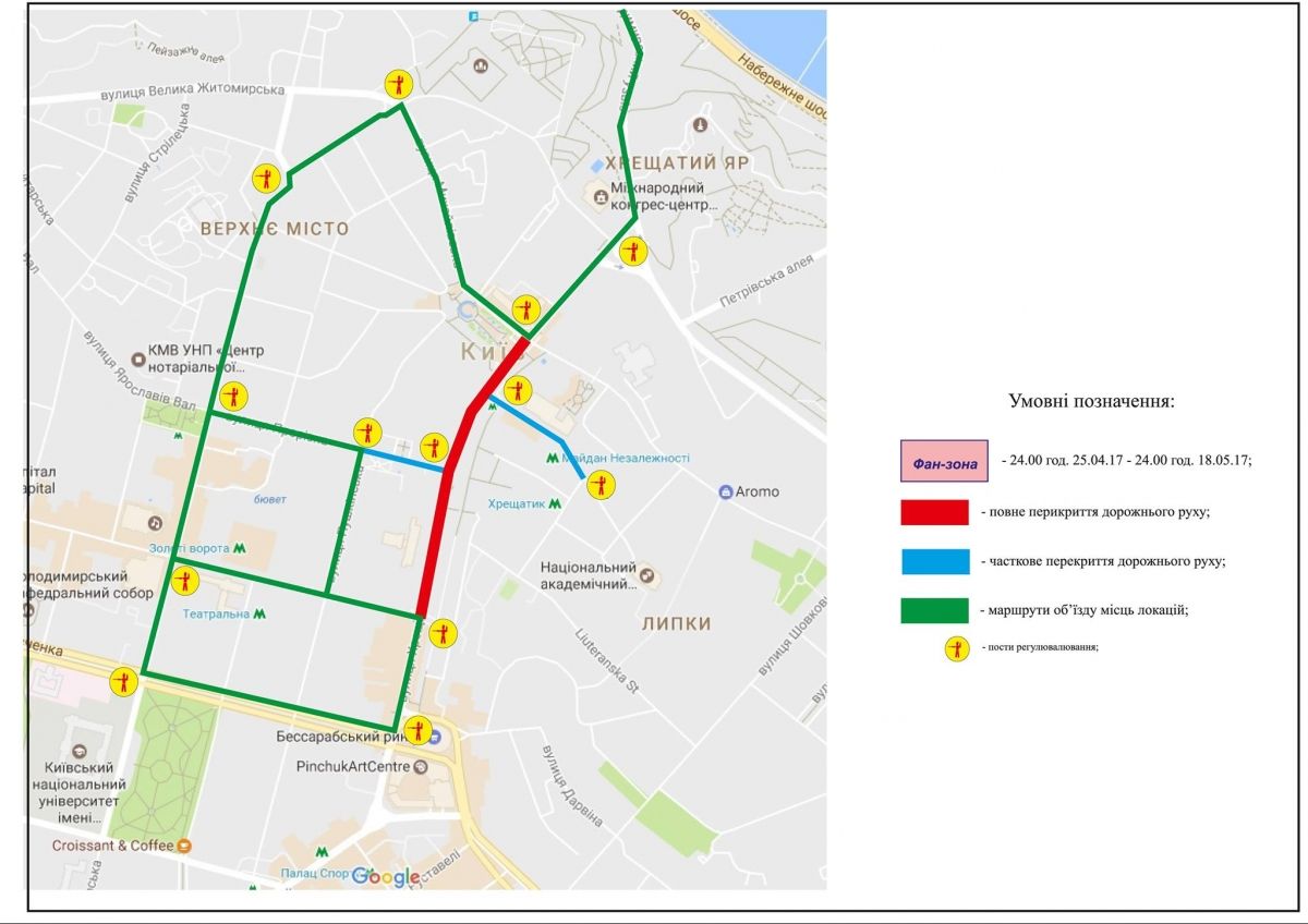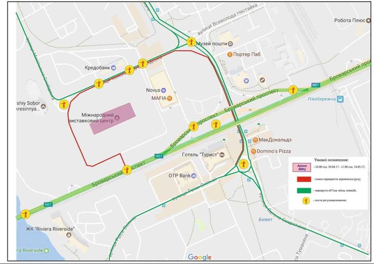 Як стало відомо, обмеження руху діятиме упродовж 25 квітня і до 18 травня. Тимчасово недоступними для пішоходів та транспорту будуть вулиці у середмісті столиці, а також у районі метро "Лівобережна" біля МВЦ – головної локації Євробачення-2017.