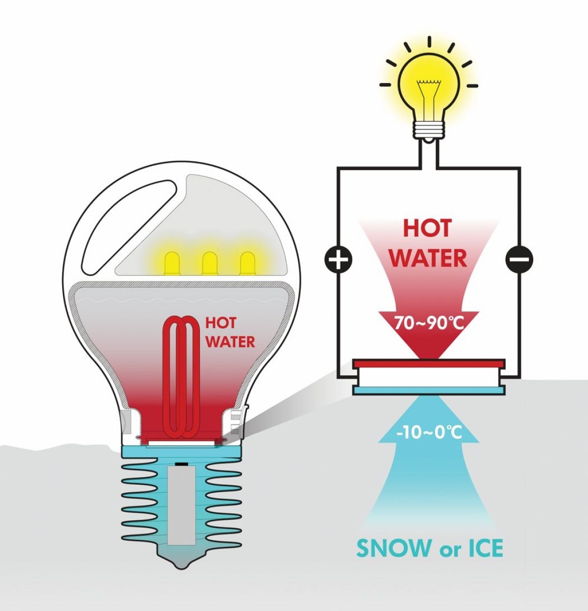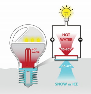 Треба залити воду в вакуумну колбу і прикрутити термоелектричний генератор. Після цього користувачеві залишається тільки опустити радіатор в щось холодне, наприклад, відерце зі льодом. Таким чином, термоелектричний генератор проводить електрику з допомогою різниці температур між двома частинами пристрою. Додамо, що пристрій також може використовуватися і як джерело світла.