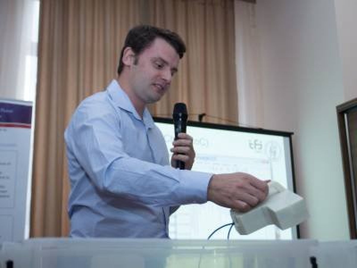 "Наразі ми презентуємо результат перших 9 місяців роботи – це не остаточний пристрій, а лише робочий прототип – ручний георадар. У подальшому до нього буде писатися софт, який зробить з цього пристрою 3D-міношукач", – розповів один з учасників проекту, докторант Норвезького університету Юрій Войтенко.