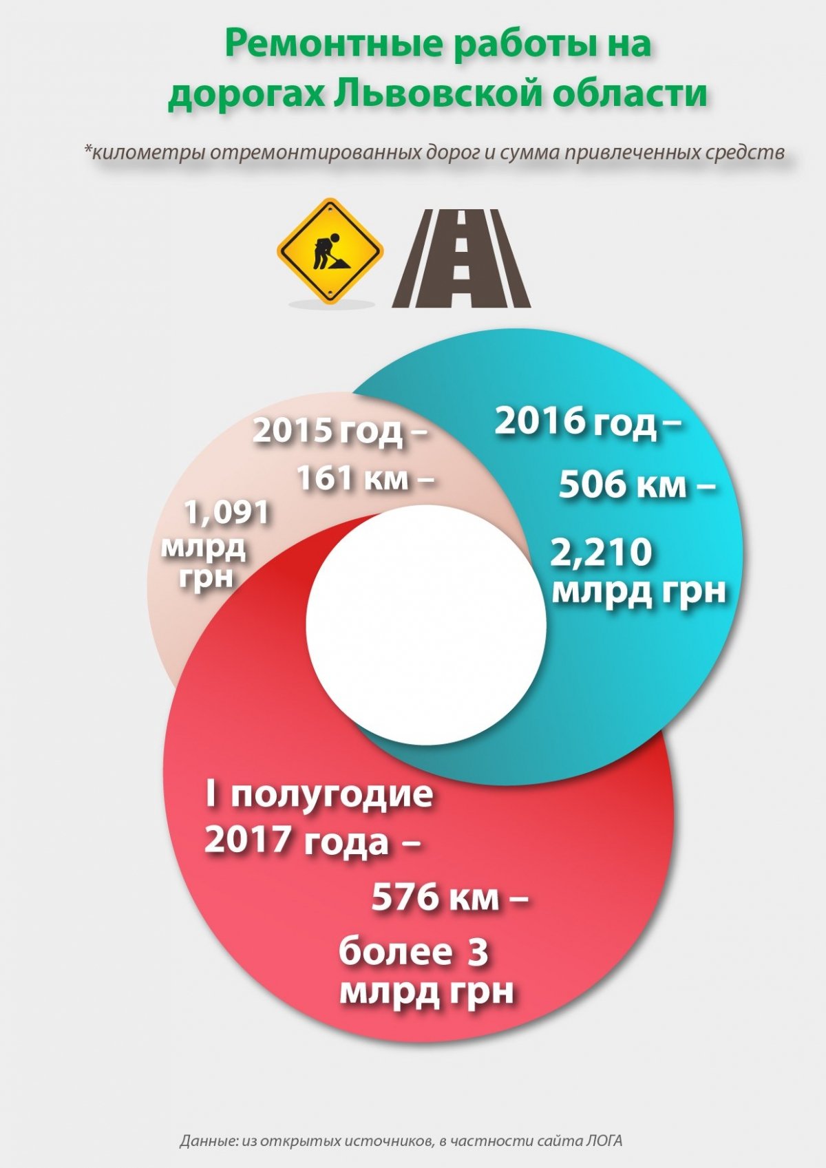 Ремонти доріг, кажуть, - пунктик Олега Синютки. І цифри тут говорять самі за себе: у 2015 році відремонтовано 161 км, тоді як в 2016-му – протяжність ремонтних робіт збільшилась в три рази! Минулий рік став для Львівщини з позначкою "рекордний" – регіон став лідером з залучення фінансового ресурсу на ремонт доріг. За підсумками 2016 року регіон отримав 2,210 млн грн на ремонт дорожнього покриття. У планах на 2017й – відремонтувати близько 550 кілометрів. Сума коштів близько 3 млрд грн.