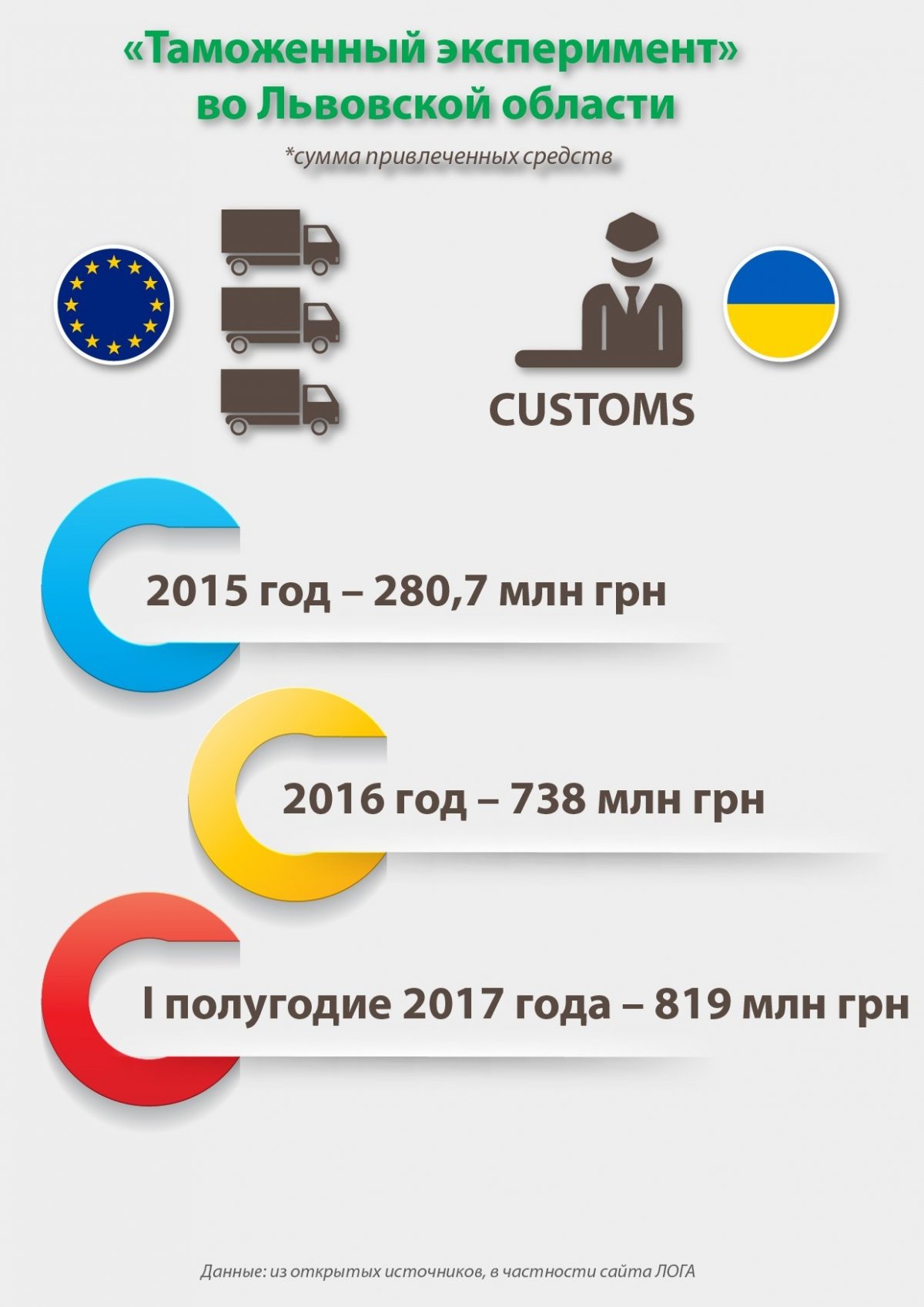 Пілотний проект з промовистою назвою «Митний експеримент» стартував у Одеській, Волинській, Львівській та Чернівецькій областях у вересні 2015-го. 50% зібраних позанормово митних платежів спрямовувались на ремонт доріг державного значення. Вже за рік Львівщина встановила рекорд: на ремонт автомобільних доріг області вдалось залучити понад 1 млрд грн. Загальна сума надходжень від митних платежів на території регіонів України, де діяв експеримент, становить 2,25 млрд грн. Таким чином, встановивши рекорд серед пілотних регіонів, саме Львівська область принесла в державний бюджет левову частку від всіх надходжень проекту – 40%. Експерти відзначили, що таких показників у регіоні вдалось досягнути насамперед завдяки подолання корупції на митниці.