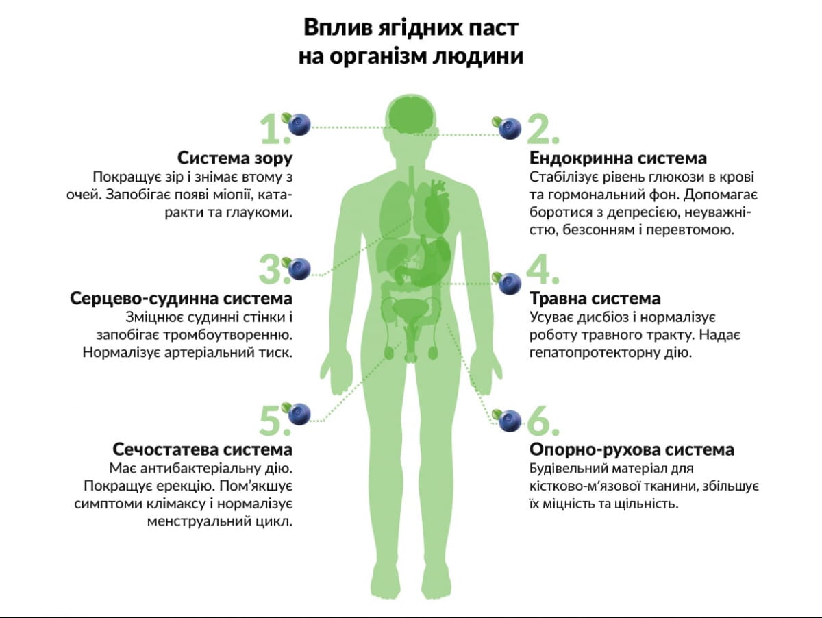 Чорничну пасту схвалив науковий центр Міністерства охорони здоров'я України в якості дієтичної добавки. Також вона рекомендується різними інститутами, зокрема: Інститутом кардіології ім. академіка М.Д. Стражеска; Інститутом експериментальної патології, онкології і радіобіології Р.Е. Кавецького; Інститутом очних хвороб і тканинної терапії ім. В.П. Філатова; Сумським державним університетом МОН України. Продукція рекомендується в якості імунокоректора, поліпшує зір, має позитивний вплив на серцево-судинну систему, є потужним антиоксидантом.