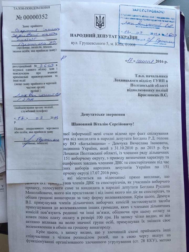 "За фактом оприлюднення відео, де представник кандидата Богдана займається примусом членів ДВК до фальсифікацій, звернувся до керівника Лохвицького райвідділу поліції. У депутатському зверненні вимагаю надати правову оцінку діям Демчука В. І. та у разі виявлення порушення законодавства вжити відповідних заходів", – повідомив депутат.
