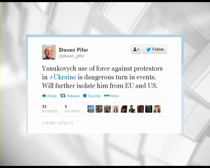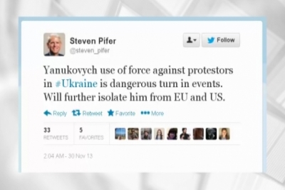 На своїй сторінці у Твіттері він застеріг: застосування владою сили проти мирних протестувальників - може ізолювати уряд Януковича як від ЄС, так і від США. Напередодні Сполучені Штати вже застерігали українську владу про серйозні наслідки для двосторонніх відносин у разі силового розгону Майдану.