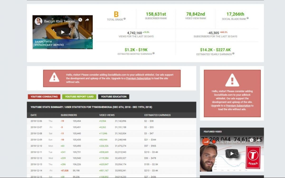 Відеохостинг YouTube видалив фейкових підписників і вимкнув перегляди ботів з різних каналів. Від цього дуже постраждали деякі канали політичного спрямування, а найбільше підписників втратила сторінка лідерки "Батьківщини" Юлії Тимошенко. Про це повідомляє Kendoo Analytics.