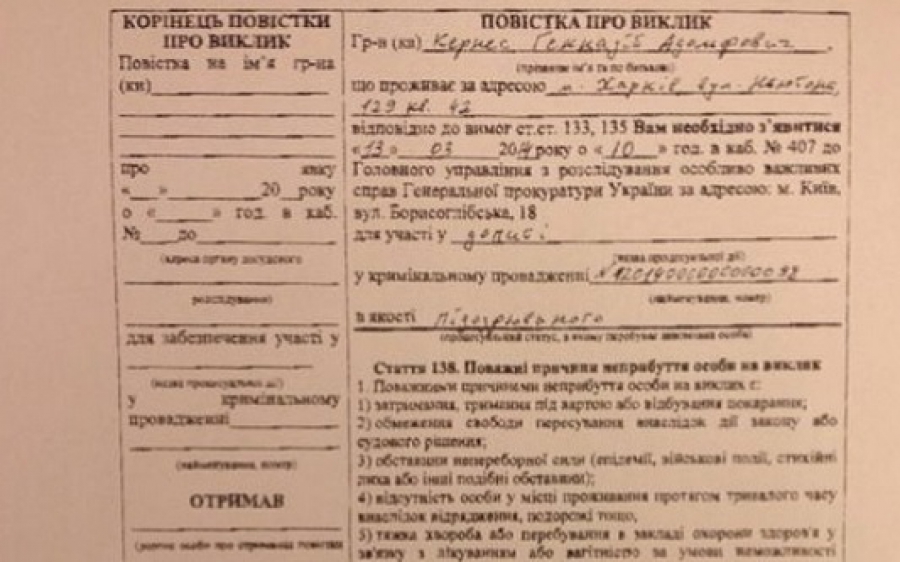 Згідно з документом, Кернес зобов’язаний з’явитися о 10.00 у четвер, 13 березня, до слідчого управління за адресою: Київ, вулиця Борисоглібська, 18, для участі в допиті.