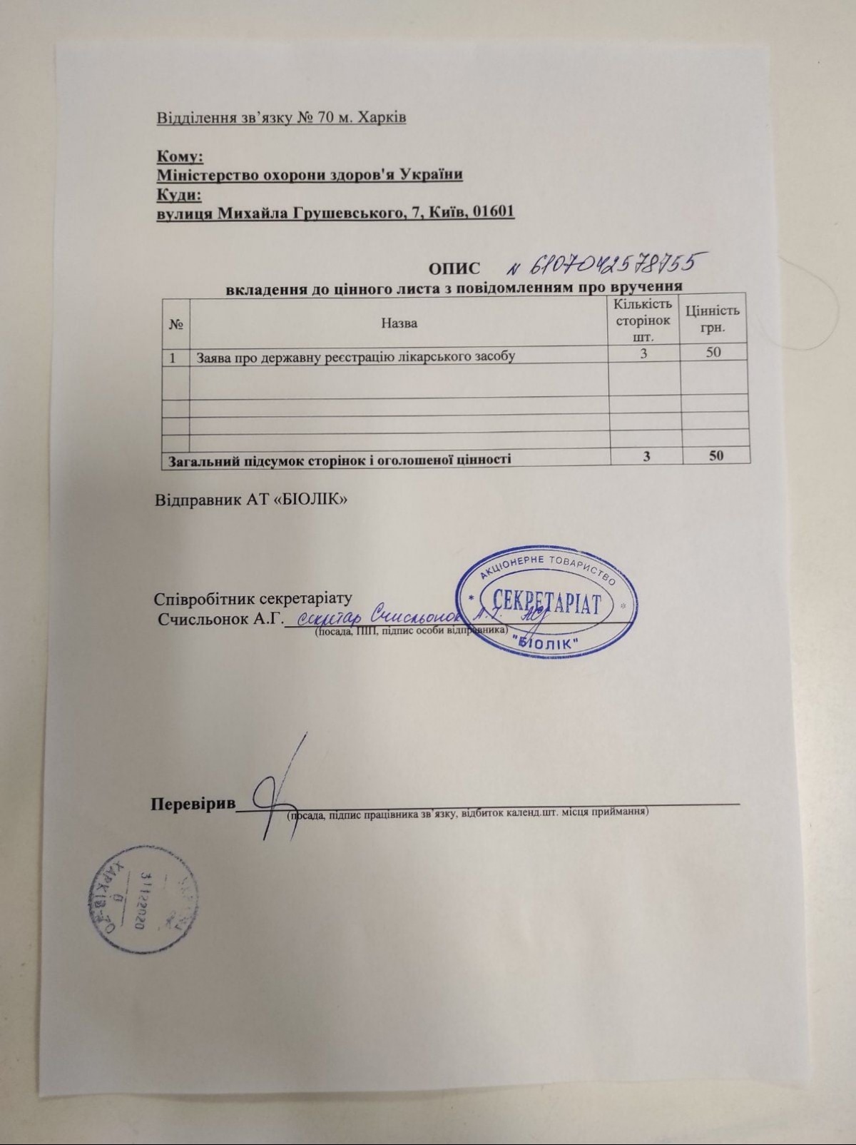 Документ, який спрямували до відомства ще 31 грудня, оприлюднили сьогодні на сайті фармацевтичної компанії. У ньому зазначено, що заявник – як юридична компанія "Біолік" – несе відповідальність за якість, безпечність та ефективність лікарського засобу.