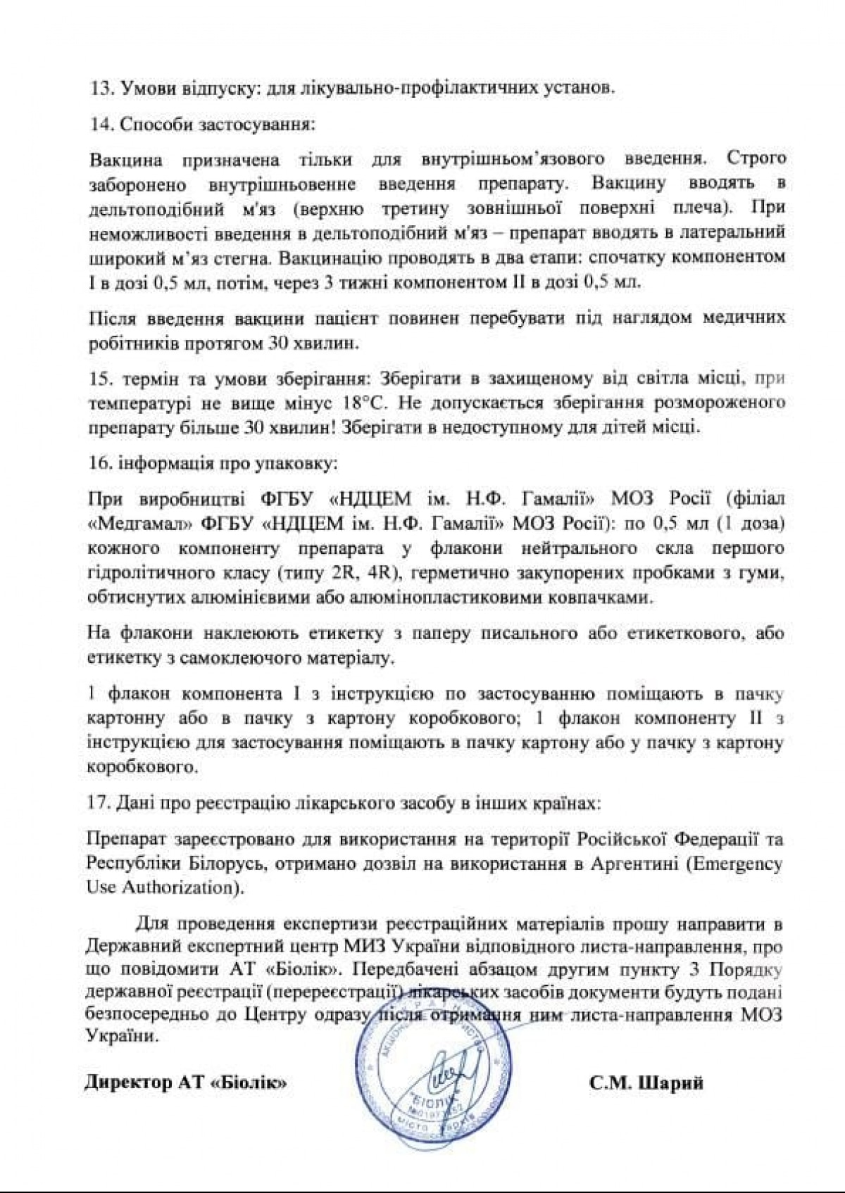 "У зв'язку з численними запитами Адміністрація АТ "БІОЛІК" повідомляє, що 31.12.2020 р. на адресу МОЗ України ми дійсно відправили Заявку про державну реєстрацію лікарського засобу – вакцини Гам-КОВІД-Вак, комбінованої векторної вакцини для профілактики коронавірусної інфекції, викликаної вірусом SARS-CoV-2, виробництва ФДБУ "НДЦЕМ ім. М.Ф. Гамалії, МОЗ РФ", – йдеться у повідомленні.