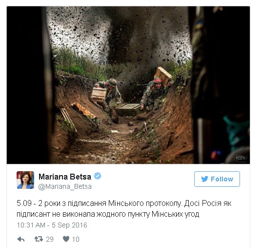 "5.09 – 2 роки з підписання Мінського протоколу. Досі Росія як підписант не виконала жодного пункту Мінських угод", – написала вона.