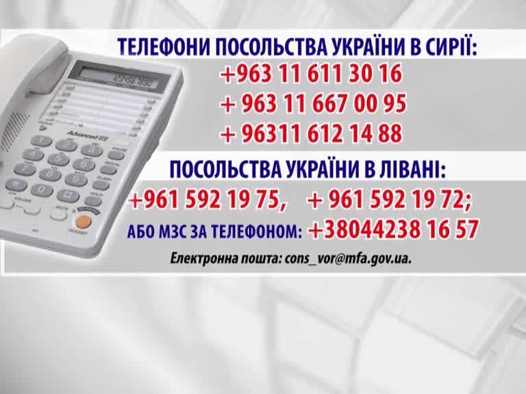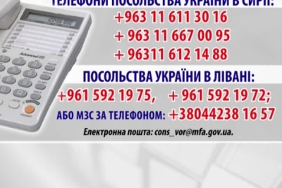 Телефони посольства України в Сирії: +963 11 611 30 16 + 963 11 667 00 95 + 96 311 612 14 88; посольства України в Лівані: +961 592 19 75 + 961 592 19 72; МЗС: +38044238 16 57, +38044253 11 24, електронна пошта [email protected].