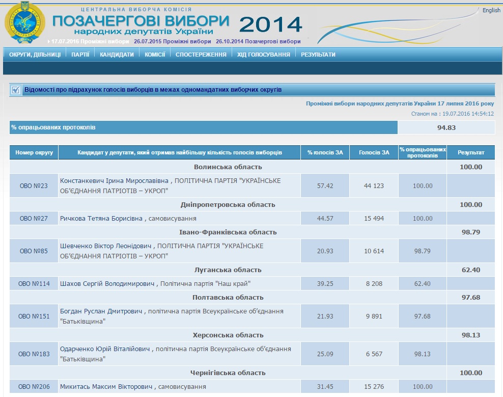 На сайті ЦВК оприлюднені результати оброблених 100% протоколів. За цими даними Констанкевич отримала 57,42% голосів виборців (44123 голосів "за"), кандидат від "Батьківщини" Людмила Кирда набрала 12,94%, представник "Радикальної партії" Сергій Була - 8,71%, самовисуванець Федір Веніславський - 5,17%, інші кандидати набрали менше 4%, передає "Інтерфакс-Україна".