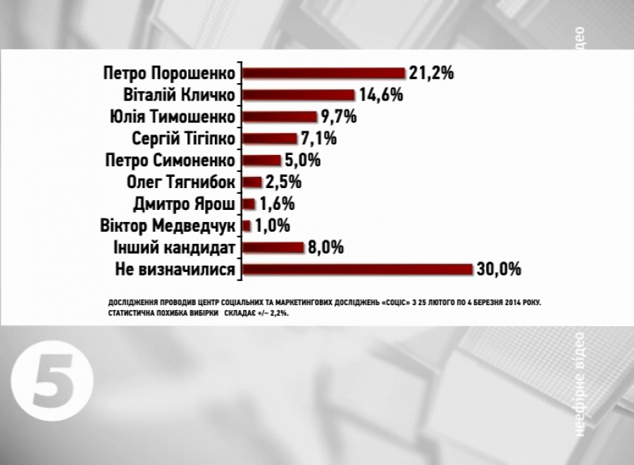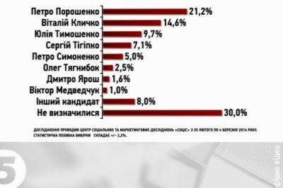 Згідно з опитуванням, Петра Порошенка підтримують понад 21% українців. Другу позицію посідає лідер партії «УДАР» Віталій Кличко. За нього б проголосували понад 14 з половиною відсотків громадян. Третє місце в екс-прем’єра Юлії Тимошенко – понад 9 з половиною процентів. Народного депутата від Партії регіонів Сергія Тігіпка підтримали б трохи більше 7-ми відсотків виборців. За лідера КПУ Петра Симоненка проголосували б 5% респондентів, за Олега Тягнибока зі «Свободи» – два з половиною відсотків, і за керівника руху «Правий сектор» Дмитра Яроша - більше одного з половиною процентів. Майже вісім відсотків опитаних кажуть, що віддали б свій голос іншому кандидату у Президенти, якого не було у списку запропонованих. А 30% виборців ще не знають, за кого б голосували і чи взагалі прийшли б на вибори. Вибори Президента України відбудуться 25 травня.