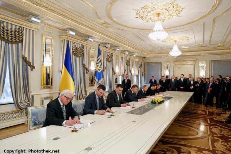 Под Угодою свої підписи поставили представники опозиції - Віталій Кличко, Арсеній Яценюк та Олег Тягнибок, представник влади - Віктор Янукович. Від Європейського Союзу Угоду засвідчили Федеральний міністр закордонних справ Федеративної Республіки Німеччина Франк-Вальтер Штайнмаєр, Міністр закордонних справ Республіки Польща Радослав Сікорський та керівник Департаменту континентальної Європи Міністерства закордонних справ Французької Республіки Ерік Фурн’є.