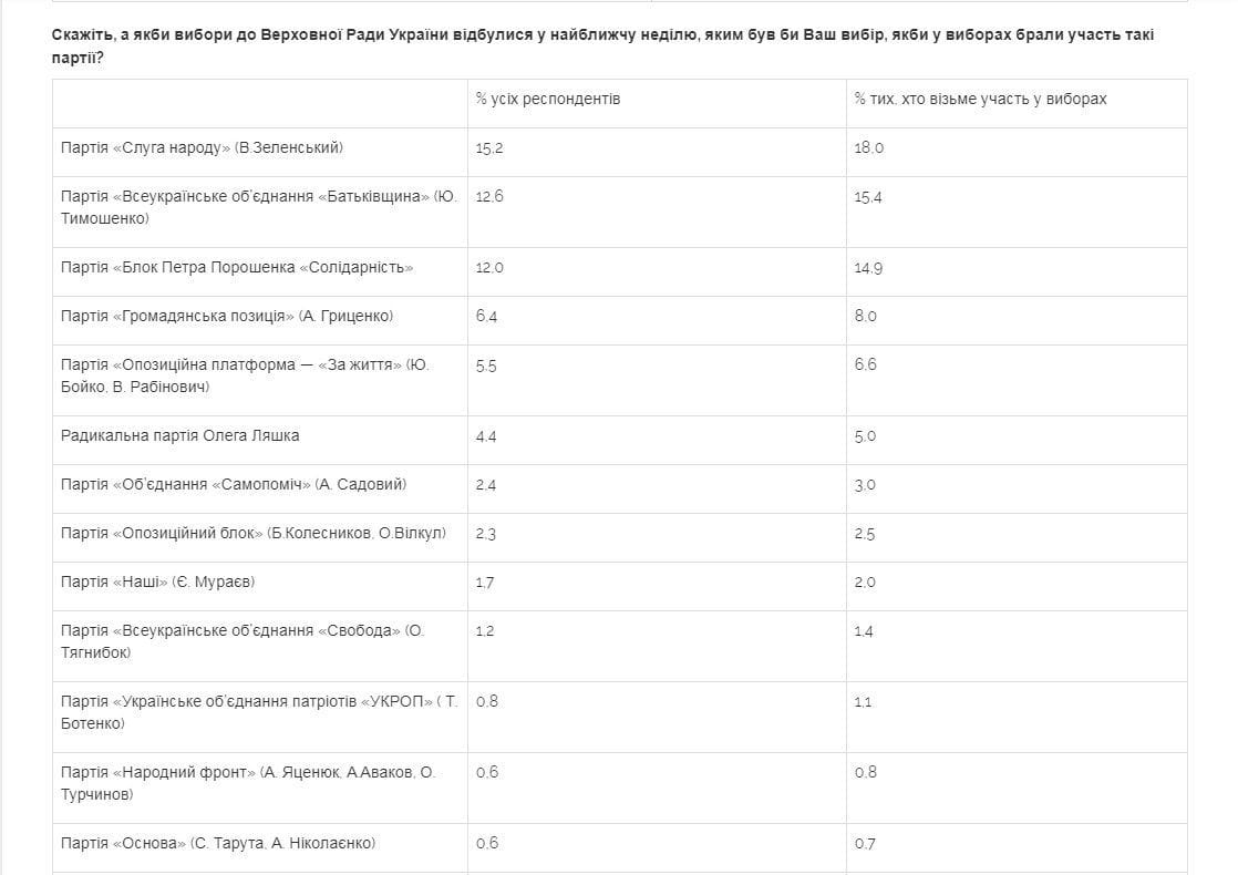 Відповідно до останнього соціологічного дослідження Центру Разумкова, якби вибори до Верховної Ради відбулися найближчим часом, то за партію Володимира Зеленського "Слуга Народу" проголосували би 18% з тих, хто візьме участь у виборах.